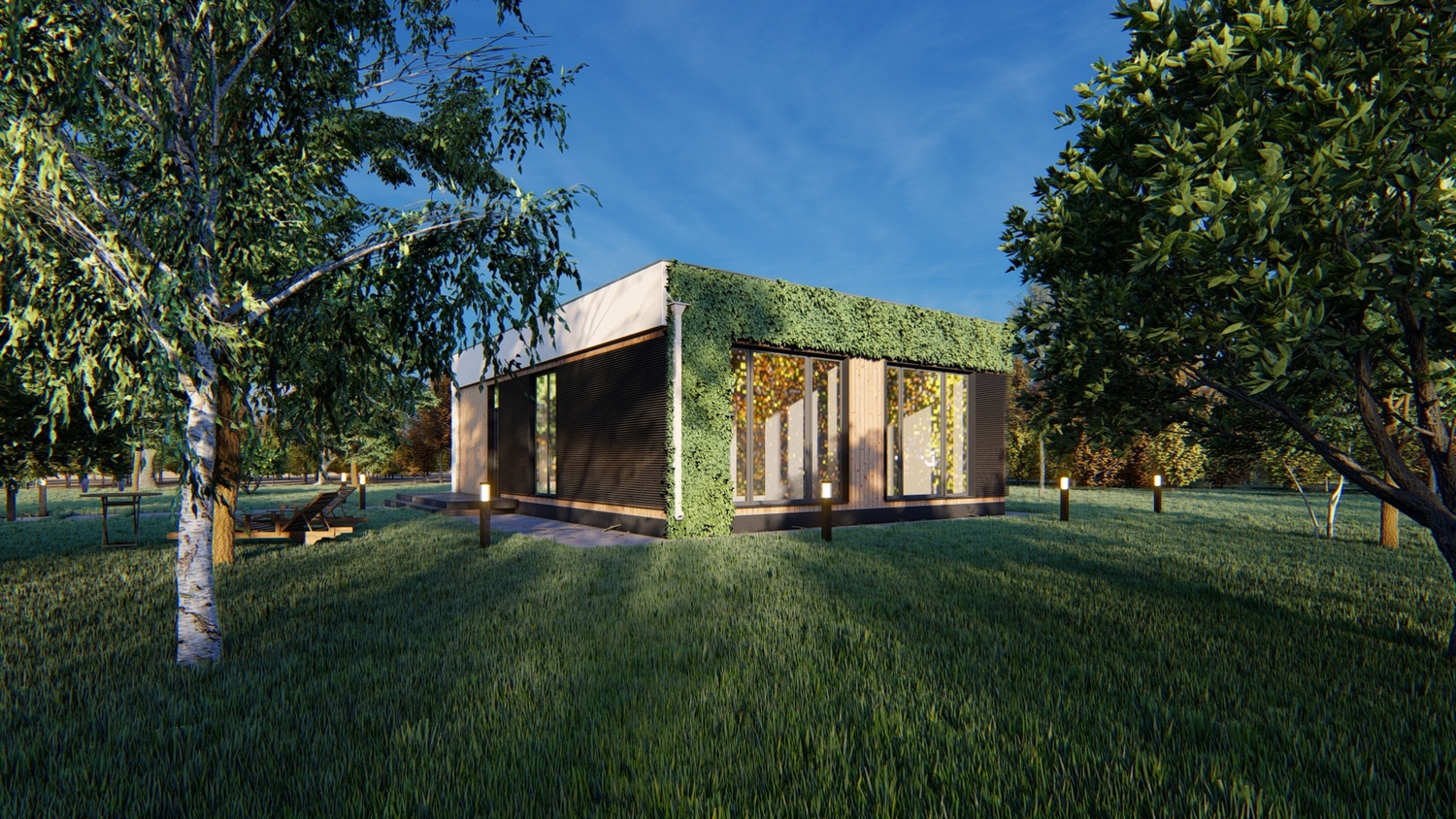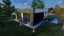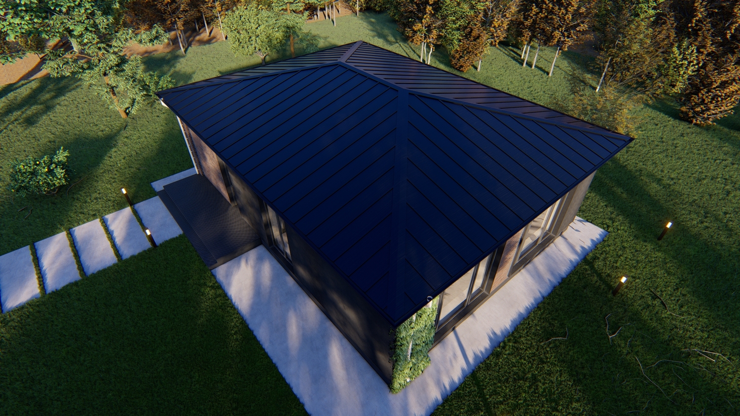 Большие панорамные окна еще больше подчеркивают единение с природой. Такой вариант – отличный выбор для жизни за городом. Внутренне пространство поделено так, что для каждого члена семьи здесь имеется свое отдельное помещение для отдыха и работы.